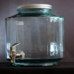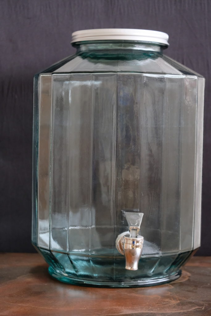 Contenitore in vetro con rubinetto in metallo da 5 e da 10 lt da posizionare ai margini di una cerimonia, su un buffet fa aperitivo o in un dopocena estivo .