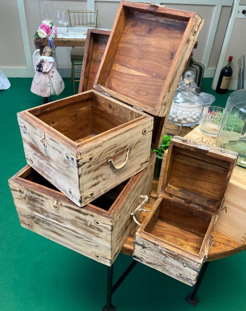 3 misure di bauletti in legno sbiancati da utilizzare come contenitori , come decorazioni o cmoe alzate per buffet.